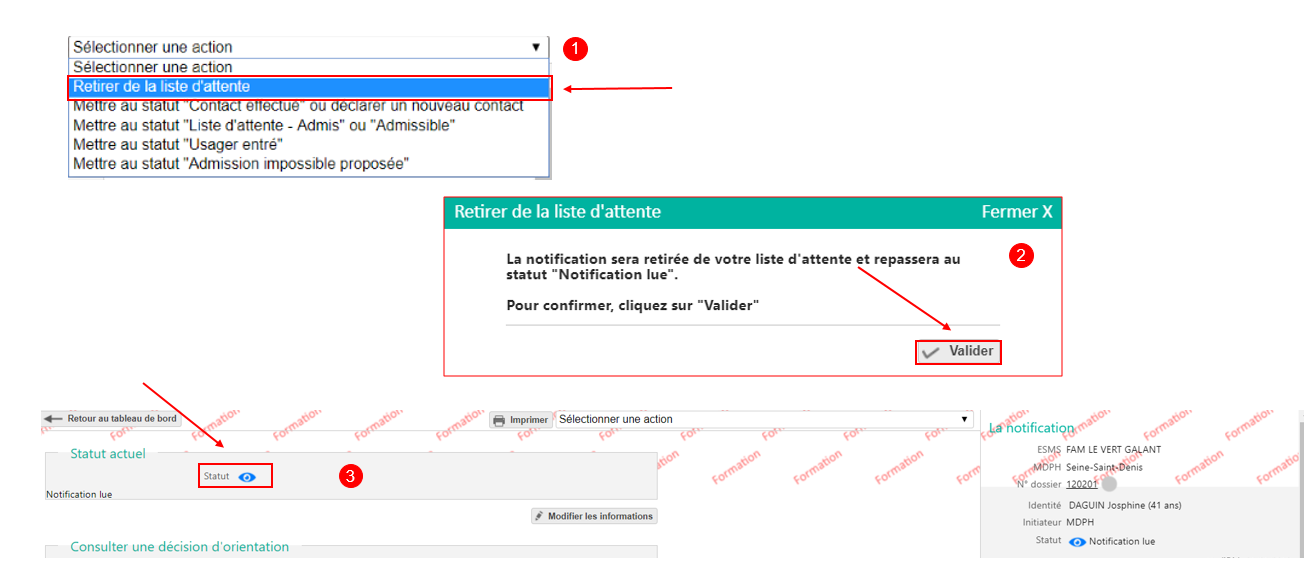 Lorsque vous souhaitez retirer une personne de votre liste d’attente, il existe une action « retirer une notification de la liste d’attente » qui permet de repasser la notification au statut « notification lue ».