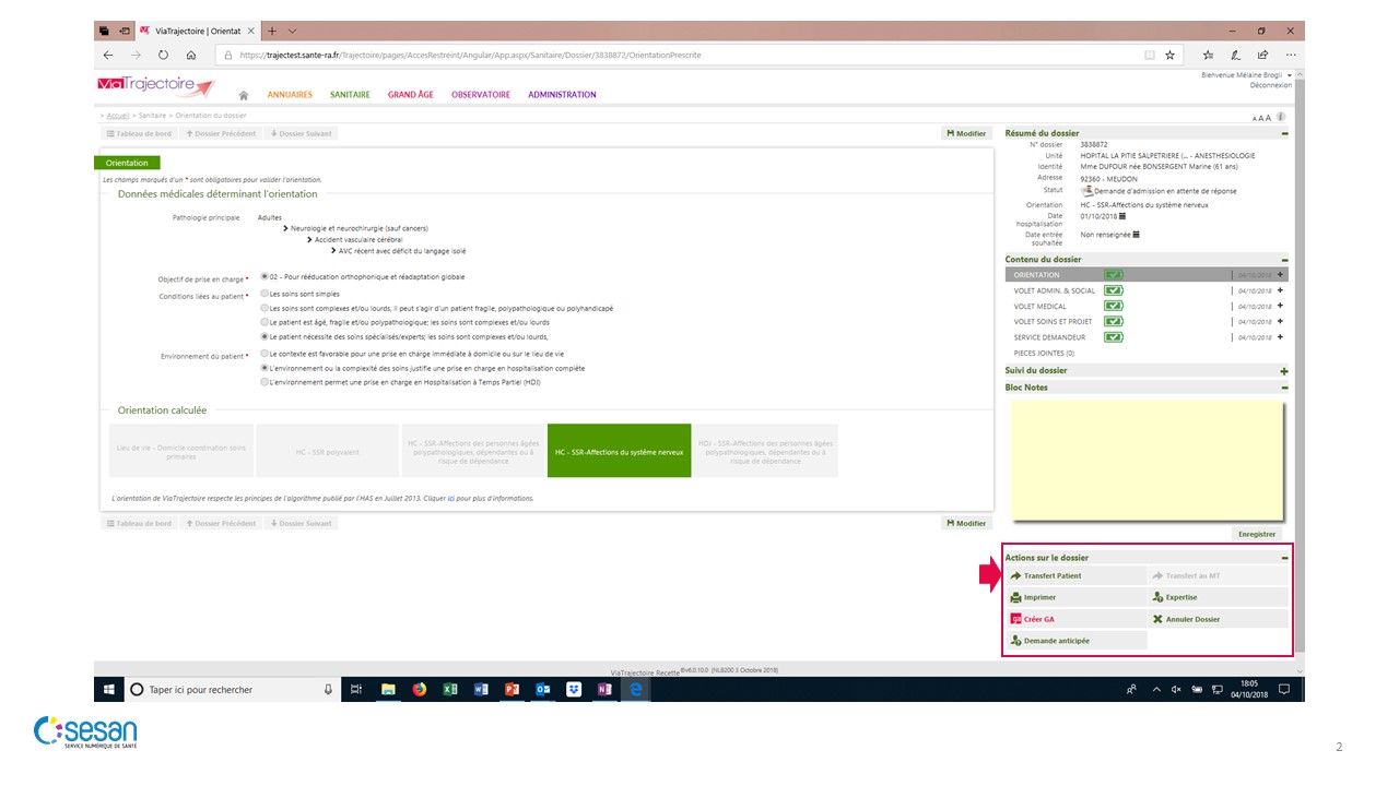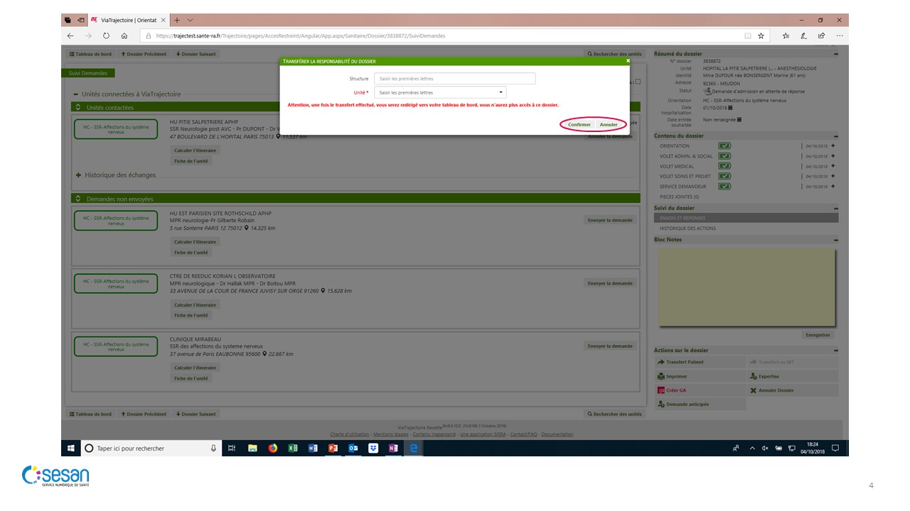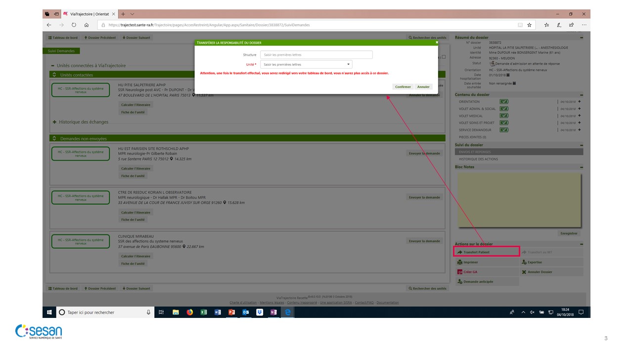 ATTENTION : Cette action ne peut être effectuée que si l’unité suivante dans le parcours d’hospitalisation a donné son accord pour accueillir le patient (échanges entre confrères préalables). Elle est totalement distincte de la demande d’admission auprès de SSR/HAD/USP/SSIAD et concerne uniquement les transferts entre unités MCO (médecine interne vers la cardiologie par exemple).